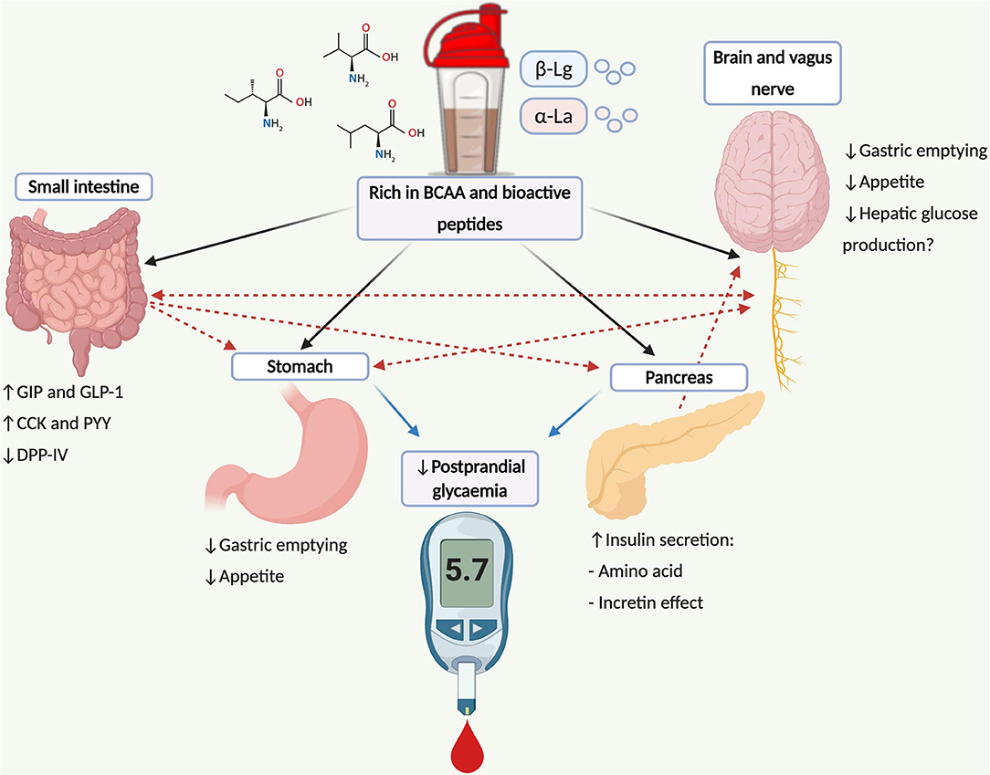 Figura 1: Efeito da suplementação do Whey Protein na saciedade, apetite, glicemia pós-prandial, secreção de insulina, cerebral e no nervo vago.
