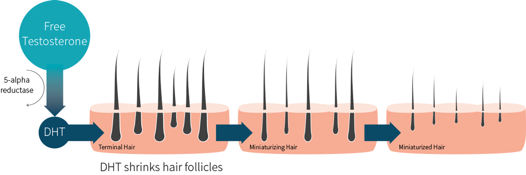 Uma enzima chamada 5-alfa-redutase converte testosterona livre (testosterona não ligada à albumina sérica ou globulina ligadora de hormônios sexuais (SHBG)) em DHT. A DHT pode se ligar a receptores nos folículos pilosos do couro cabeludo, fazendo com que eles encolham e cessem a produção de cabelo ao longo do tempo. Drogas que bloqueiam as ações da 5-alfa-redutase, como a finasterida, podem ser muito eficazes na prevenção da perda de cabelo.